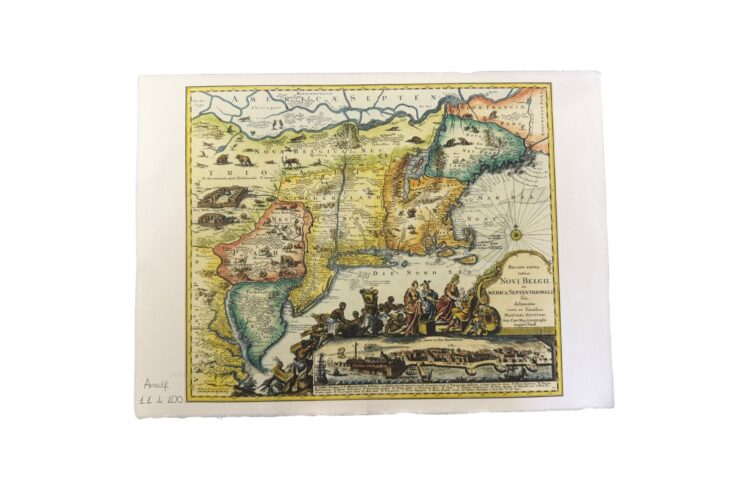 Mappa Antica “America Septentrionalis – Totus Novi Belgii” con Fauna Illustrata – Carta 100% Cotone, Tiratura Limitata