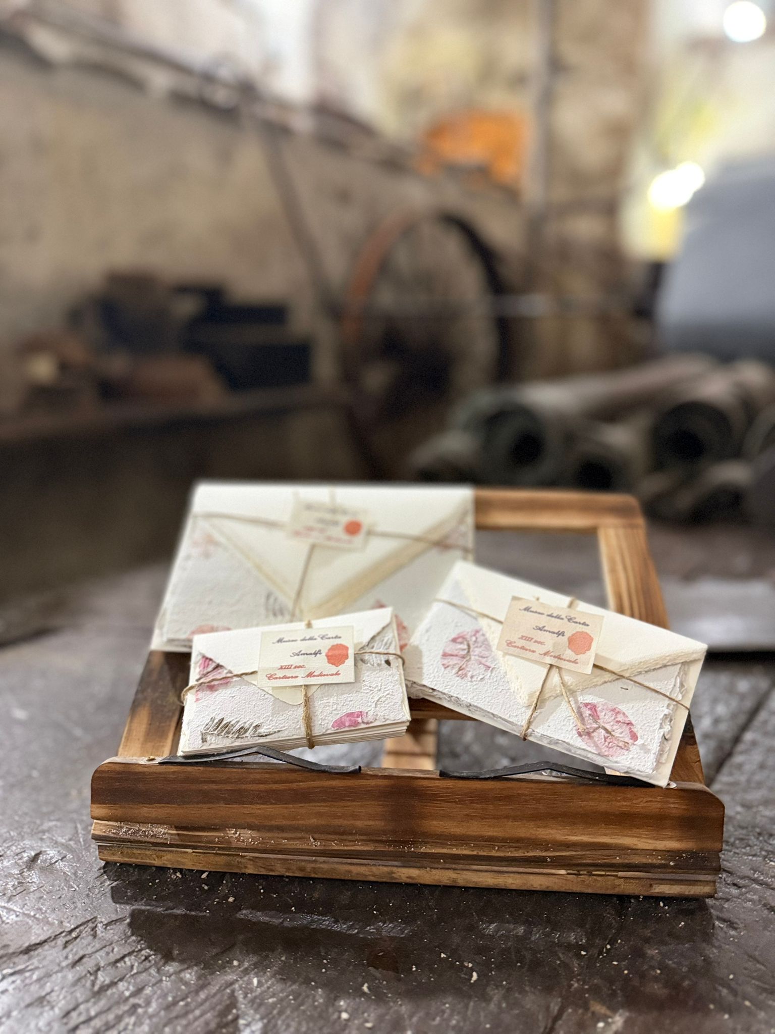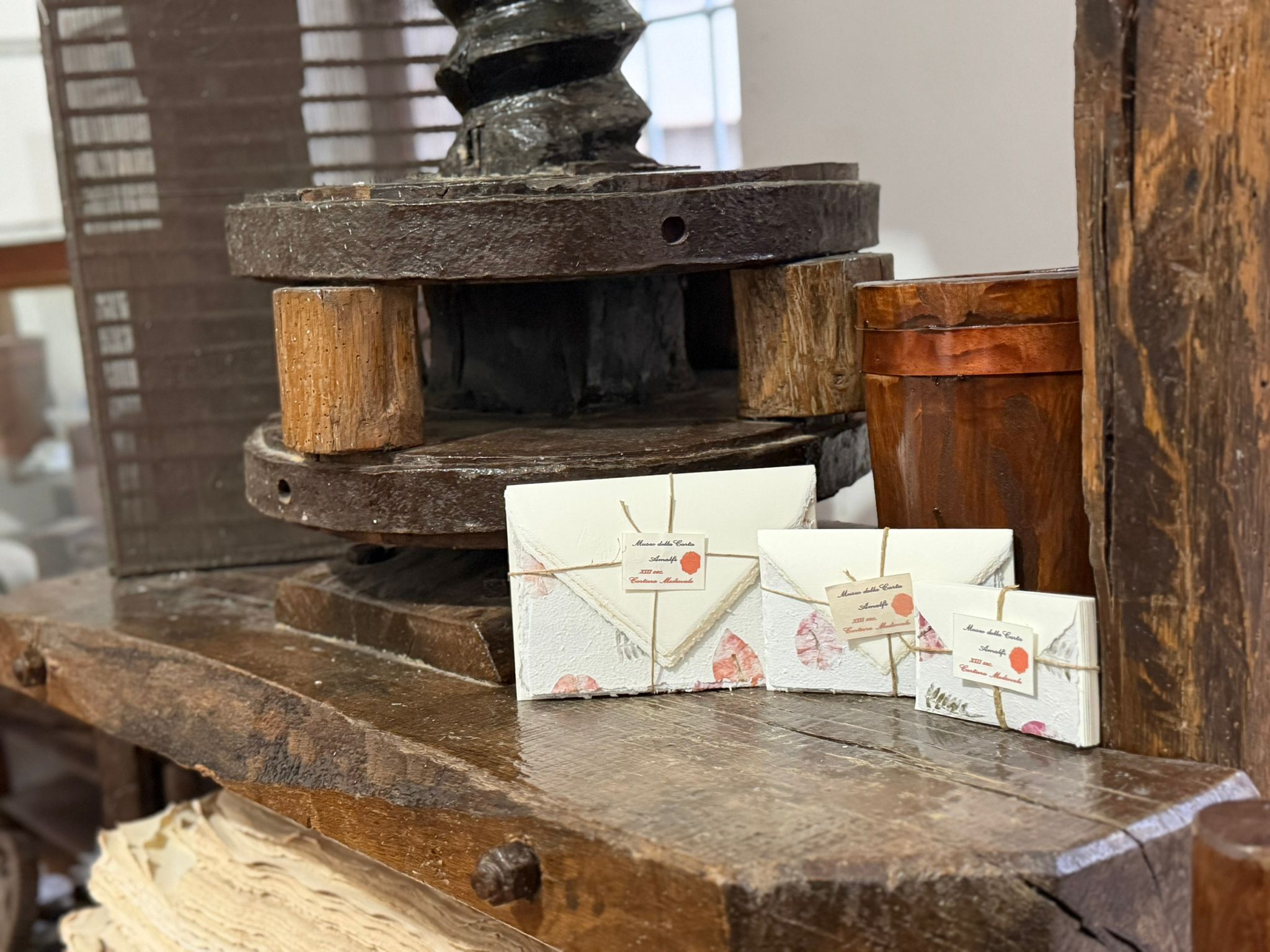 Le buste sono realizzate nel classico e raffinato colore avorio, in armonia con la tradizione cartaria amalfitana e perfettamente abbinate alla texture naturale dei fogli.