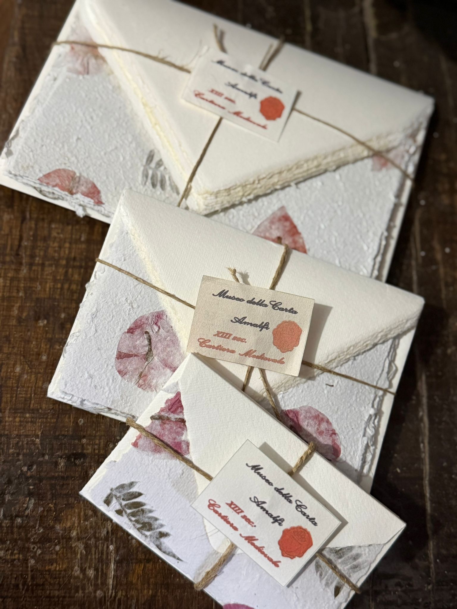 Set di 10 buste avorio con fogli in carta a mano amalfitana 100% cotone, realizzati artigianalmente secondo la tradizione delle cartiere della Costiera Amalfitana. Disponibile in tre formati (14×9 cm, 12×18 cm, 11×7 cm), ogni foglio contiene fiori veri inseriti a mano con disposizione casuale. Un prodotto elegante, unico e ideale per lettere speciali o inviti di pregio.